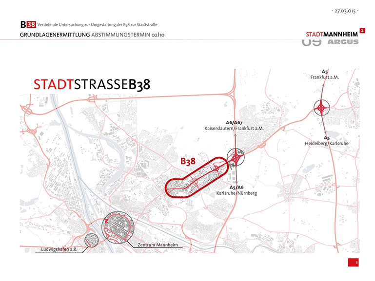 Am nordöstlichen Rand der Stadt Mannheim werden in den nächsten Jahren ehemalige amerikanische Militärflächen zu ei- nem innovativen Stadtteil umgebaut. Die Flächen grenzen direkt an die Bundesstraße B38. Die vier- bis sechsspurige Straße mit ihren 60.000 Fahrzeugen am Tag ist bisher autobahnähnlich aus- gebaut. Die Stadt Mannheim möchte die B38 so umbauen, dass sie zur effizienten Erschließung der neuen Quartiere beiträgt und eine adressbildende Funktion als repräsentativer, öffentli- cher Raum übernimmt.