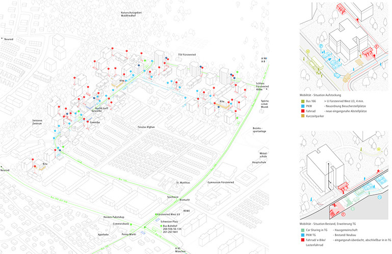 Die Bayerische Versorgungskammer plant, das Wohngebiet Fürstenried-West, das in den 1960er Jahren am westlichen Stadtrand von München als aufgelockerte, monofunktionale Wohnsiedlung gebaut wurde, mit rund 600 Wohneinheiten nachzuverdichten. Im Rahmen eines zweistufigen Realsierungswettbewerbs hat orange edge für LIN Architekten ein Mobilitätskonzept entwickelt, das neue Mobilitätsangebote und -dienstleistungen zu einem Element des Städtebaus macht.