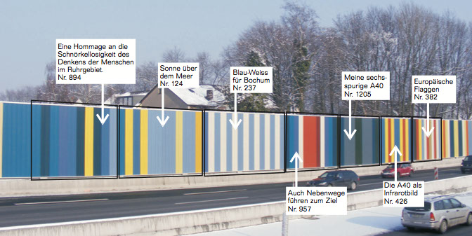 Im Rahmen des sechspurigen Ausbaus der A40 in Bochum-Wattenscheid entwickelte orange edge für Straßen.NRW ein Farbgestaltungskonzept für eine Lärmschutzwand, das Anwohnern und Nutzern die Möglichkeit bot, die A40 als Teil des sie umgebenden öffentlichen Raums mitzugestalten. Über eine Website wurden im Frühjahr 2009 insgesamt 1290 Gestaltungsvorschläge für einen jeweils acht Meter langen Wandabschnitt eingereicht. Wie ein Barcode erzählen diese Muster die Geschichten und Gedanken der Nutzer und Bewohner der Straße. Es sind Alltagsgeschichten des Ruhrgebiets, von Pommes rot-weiß über den Strukturwandel bis zum Sonnenuntergang auf der A40.