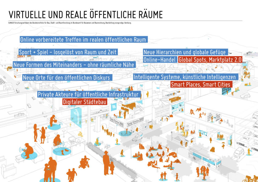Die wachsende Bedeutung virtueller Kommunikations- und Interaktionsformen verändet die Formen des sozialen Zusammenlebens und damit die Art und Weise, wie reale öffentliche Räume genutzt werden. Im Rahmen des Forschungsvorhabens wurden das Verhältnis von virtuellen und realen öffentlichen Räumen untersucht und auf Basis einer theoretischen Herleitung, qualitativer Befragungen und von Feldforschungen in unterschiedlichen öffentlichen Räumen die Vielzahl der aktuellen Phänomene und Veränderungstendenzen erfasst. Mit einem Expertengremium wurden die möglichen Auswirkungen virtueller öffentlicher Räume auf Stadtentwicklung und Baukultur sowie die weitere Ausgestaltung von Stadtentwicklungs- und Baukulturpolitik auf Bundesebene bewertet.
