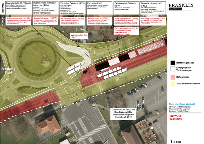 Als eines der großen Konversionsprojekte von Militärflächen in Mannheim plant die Projektentwicklungsgesellschaft MWSP, das ehemalige Benjamin-Franklin-Village in ein urbanes, emissionsarmes und zukunftsorientiertes Quartier zu entwickeln. Im Zeichen der Strategie blue_ village_franklin soll ein Quartier entstehen, das auf innovative und technologieunterstützte Entwicklungen setzt, um die Mobilität der Bewohnerinnen und Bewohner zukünftig sicherzustellen. Hierfür wurden im Rahmenplan des zukünftigen Franklin-Quartiers die Grundzüge formuliert und Mobilitätsstationen angedacht.