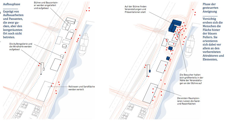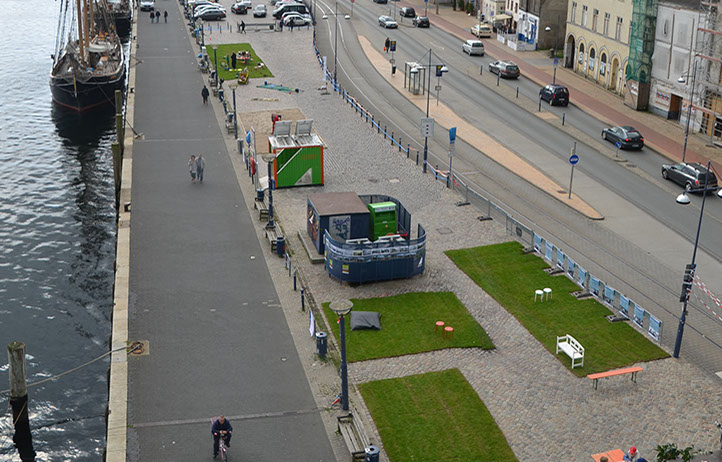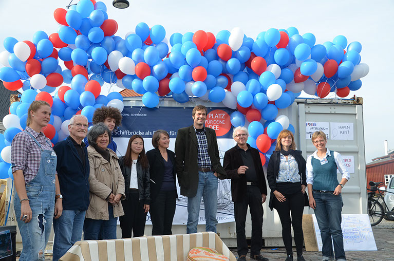orange edge entwickelte für die Stadt ein mehrstufiges Partizipationsverfahren. Zunächst wurde 2014 ein Drittel des Parkplatzes für eine Aktionswoche zu einer Freifläche umgenutzt. Ziel war es, die Schiffbrücke temporär neu zu gestalten, um so die Potenziale des Ortes als Freiraum der Stadt sichtbar zu machen. Im Laufe der Aktionswoche änderte sich das Stimmungsbild in der Bürgerschaft – von einer zunächst ablehnenden zu einer offeneren Haltung. Auch die Presseberichte änderten ihren Tenor.