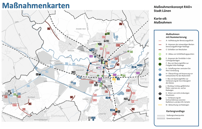 Für die Stadt Lünen wurde gemeinsam mit der Planersocietät Dortmund das Maßnahmenkonzept „RAD+“ entwickelt. Es zeigt konkrete Maßnahmen auf, um den Radverkehr in Lünen zu stärken und als Standortfaktor der Stadt zu etablieren.