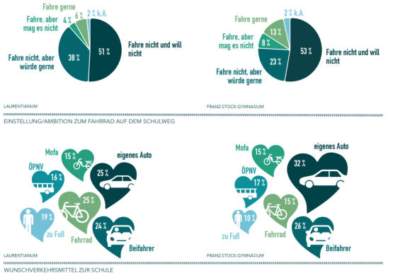 Was muss man tun, damit Schülerinnen und Schüler auf dem Weg zur Schule häufiger mit dem Fahrrad fahren? Diese Frage lässt sich in einem Fragebogen nicht so einfach abfragen. Da rationale und irrationale Gründe die Verkehrsmittelwahl beeinflussen, ist bei der Befragung ein Mix aus offenen und geschlossenen Fragen nötig. Es müssen empirische und narrative Befragungsmethoden kombiniert werden.