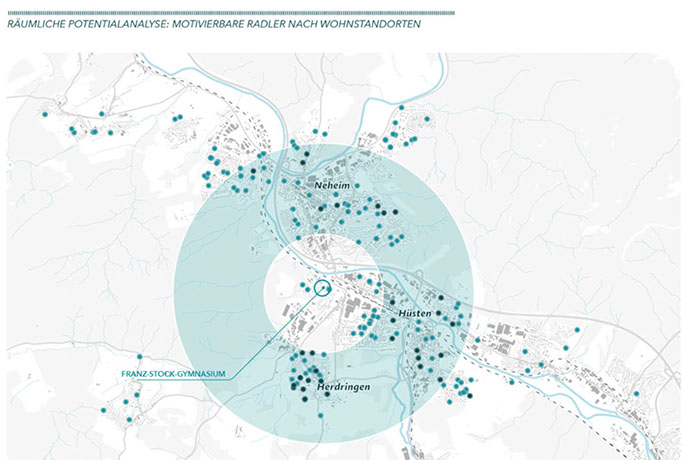 Für die Stadt Arnsberg führten wir mit einem direkten Befragungsformat eine Vollerhebung an zwei Schulstandorten durch, um die Zielgruppen der Lehrer/-innen, Schüler/-innen und Eltern direkt und gebündelt zu erreichen. Die Ergebnisse wurden anschaulich visualisiert sowieGIS-basiert ausgewertet und flossen so in die weitere Radwegeplanung der Stadt ein.