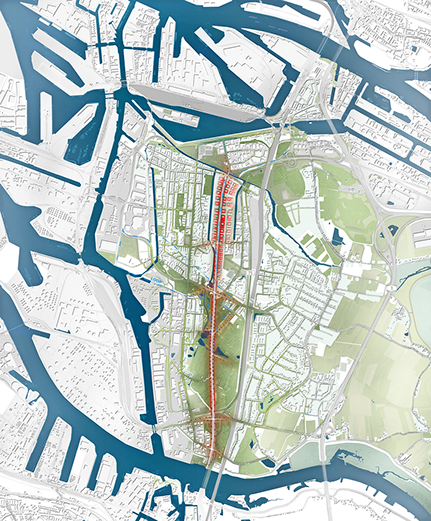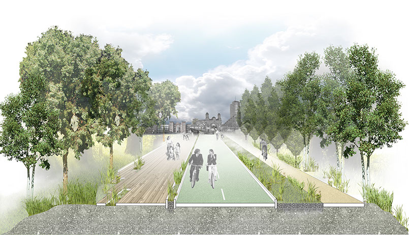 Das Konzept stellt dar, wie die Achse zur Adresse des neuen Quartiers wird, wie sie sich städtebaulich einbindet und auf diese Weise Landschafts-, Mobilitäts- und Stadtraum zu einer neuartigen „Bike Town“ verschmelzen. Das Konzept diente der BUE für die erfolgreiche Abstimmung der weiteren Entwicklung mit Verwaltung, Investoren und Politik.