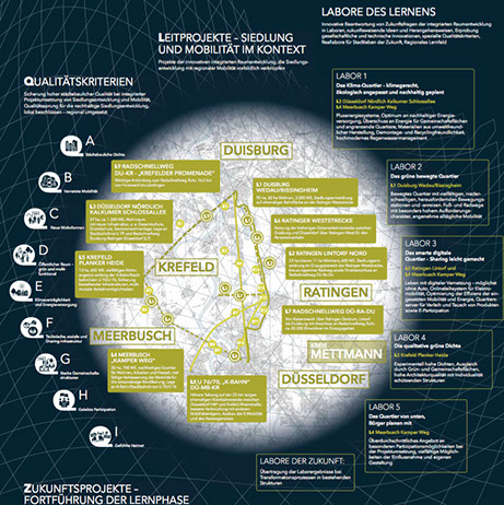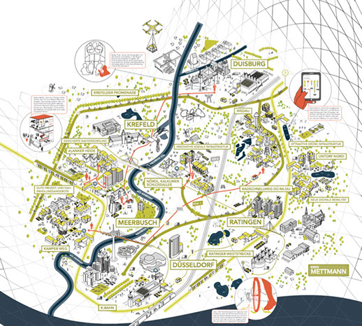Das Land Nordrhein-Westfalen suchte mit dem Wettbewerb „StadtUmland.NRW“ innovative Kooperationskonzepte für Teilregionen des Landes. Für den Beitrag der Städte Düsseldorf, Duisburg, Meerbusch, Ratingen und Krefeld hat orange edge das Konzept einer Kooperation mit Blick auf Wohnungsbau in Verbindung mit Rad- und ÖV-Mobilitätskonzepten erfolgreich visualisiert.